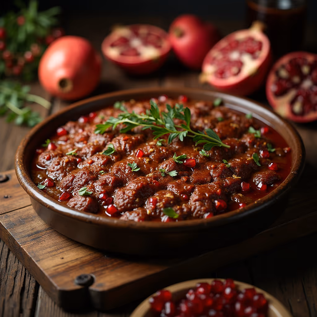 Minced lamb seasoned with Syrian spices and garlic, baked in a tray and glazed with tangy pomegranate molasses. A juicy, savory-sour dish full of depth and tradition.