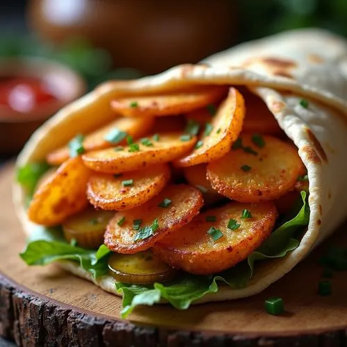 Crispy fried potato slices wrapped in warm pita with pickles, garlic sauce, ketchup, and optional chili. A Syrian street food icon β warm, crunchy, and full of flavor.