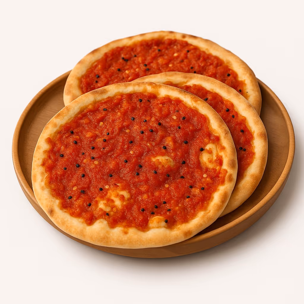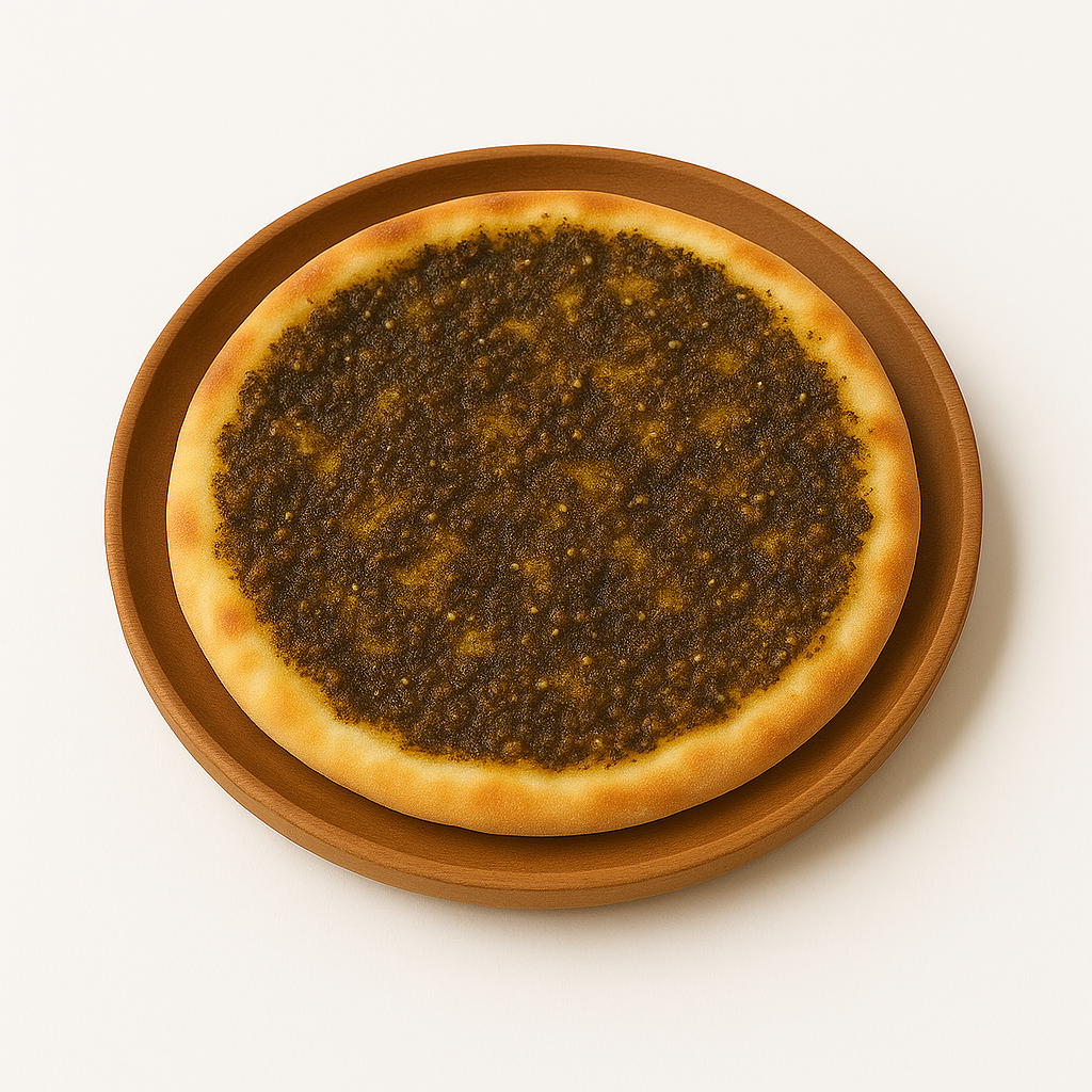 A traditional Syrian flatbread topped with zaβatar, a mix of wild thyme, toasted sesame, and sumac blended with olive oil. Baked until lightly crispy outside and soft inside. Perfect for breakfast or a warm snack.